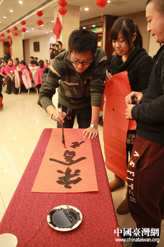 來自中國地質大學的志愿者董隆基在聯歡會上展示了精湛的書法。(中國臺灣網 孟雅詩 攝)