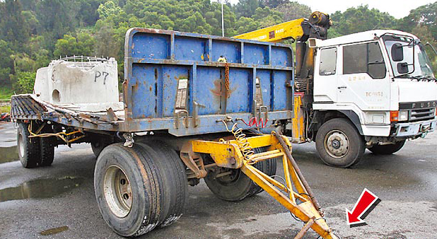 肇事聯(lián)結(jié)子車的連接器(箭頭處)斷裂。(圖片來自臺媒)