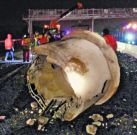 聯(lián)結(jié)車的子車脫落翻倒,車上重2公噸的水泥管滾到路中釀禍。(圖片來自臺媒)
