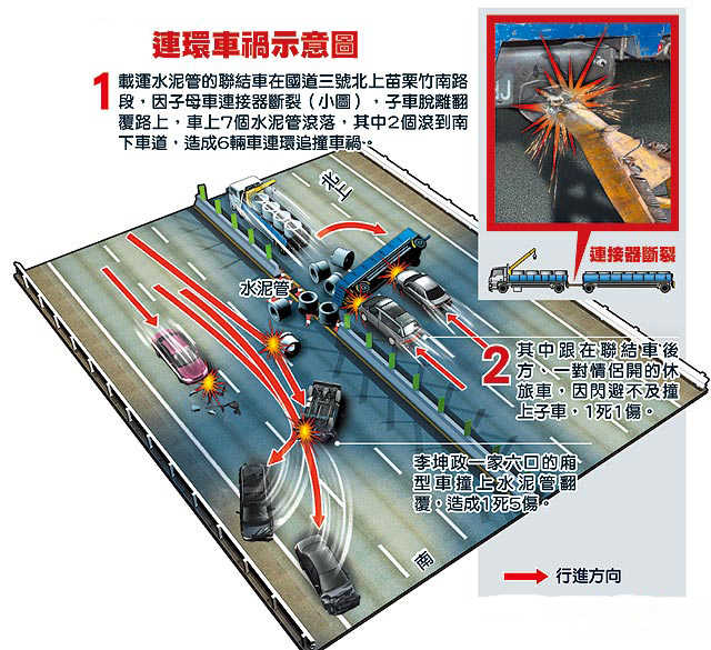 中國臺灣網(wǎng)2月23日消息 據(jù)臺灣媒體報道,臺灣昨日發(fā)生一起破壞力有如電影《絕命終結(jié)站》翻版的車禍,一輛載運巨形水泥管的聯(lián)接車昨日清晨在一處公路行駛,途中疑因子母車連接器平日保養(yǎng)維護不當(dāng)而斷裂,子車脫離后翻覆于公路上,車體橫在路面,車上7個水泥管2個滾到路面另一側(cè)車道,導(dǎo)致南北雙向共6車受撞擊,連環(huán)受損,釀成2死6輕重傷的悲劇。