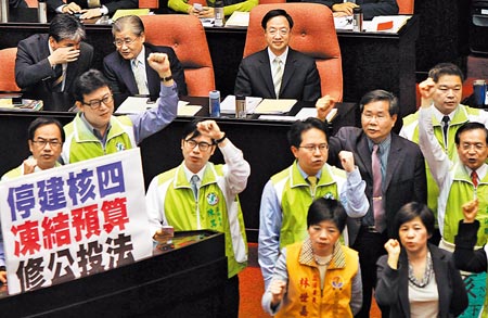 臺“立法院”26日新會期開議,核四議題成為朝野關(guān)注焦點,民進(jìn)黨、臺聯(lián)“立委”罷占主席臺杯葛施政報告并要求停建核四,坐在位子上的“行政院長”江宜樺(中上)及“內(nèi)閣”成員們不為所動,淡定以對。(圖片來自臺灣《中國時報》)