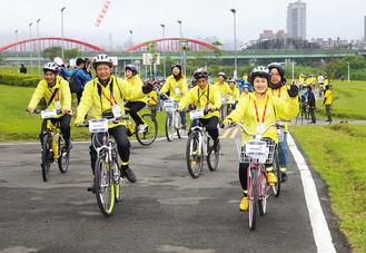 顏志榮昨天中午一馬當先,率領團員騎自行車從古亭河濱公園出發,至華中露營場,騎程約5公里,漫游河濱公園,另一組“挑戰組”從大佳河濱公園出發,騎完25公里。