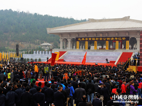 中國臺灣網(wǎng)4月4日黃陵消息 4月4日上午癸巳年(2013)清明公祭軒轅黃帝典禮在陜西黃陵縣舉行,萬余名海內(nèi)外中華兒女聚首陜西省黃陵縣橋山軒轅殿祭祀廣場,追念初祖功德,表達追思之情。
