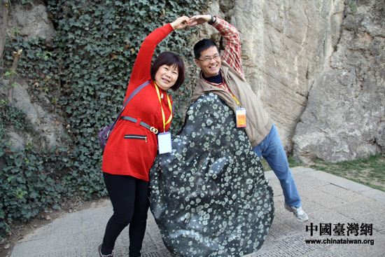 來自高雄的李維良將軍和夫人在牡丹石前留影。牡丹石:是一種不可再生的稀有資源。國際石材界公認(rèn)其為世界奇石,被列為世界珍稀品種。它集山川之靈秀,匯詩情畫意之美韻,是美石中的奇葩。(中國臺(tái)灣網(wǎng) 李丹 攝)