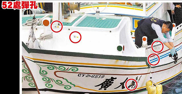 “廣大興28號”漁船11日凌晨被拖返屏東小琉球漁港,調(diào)查人員清點發(fā)現(xiàn)船身共有52處彈孔。紅圈處為彈孔位置。(圖片來自臺媒)