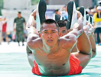 昨天下午動(dòng)態(tài)表演,陸軍海龍蛙兵首先上陣,精壯體格讓觀(guān)眾驚呼連連,在攝氏34度高溫下,鋪在地上的操作墊依然滾燙,蛙兵們不畏高溫,表演全跳、邊彎、邊腰、掌上壓等項(xiàng)目。
