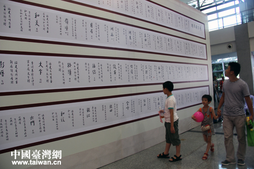 在兩岸“同名村村名”的楷書長(zhǎng)卷前駐足觀看。(中國(guó)臺(tái)灣網(wǎng) 楊麗 攝)