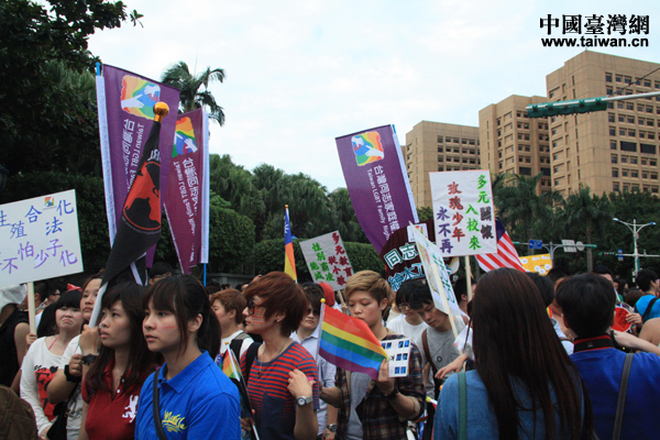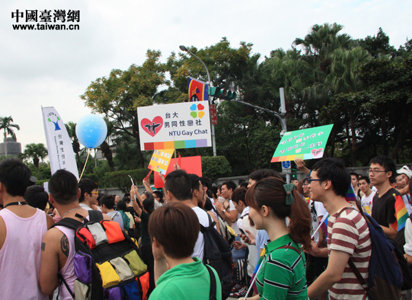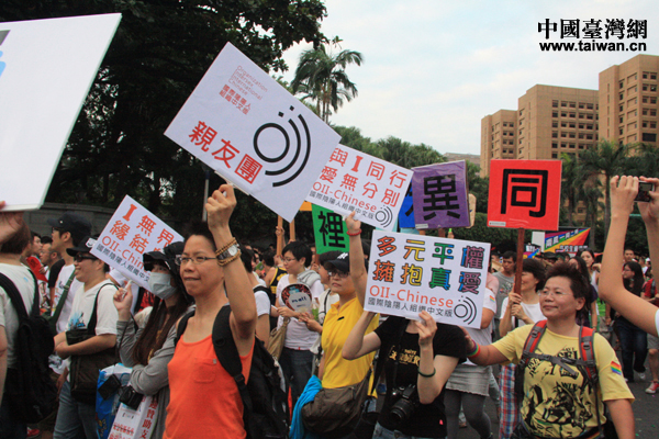 2012年10月27日,第10屆臺(tái)北同志大游行從臺(tái)北市凱達(dá)格蘭大道出發(fā),訴求“婚姻平權(quán)、性別多元”。(中國(guó)臺(tái)灣網(wǎng) 王文英 攝)