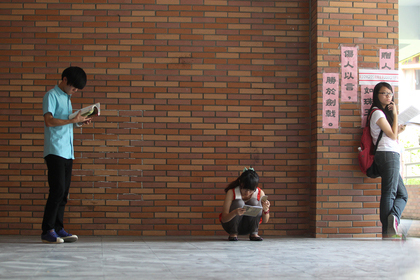 臺灣地區(qū)大學(xué)指考第二天,考試開始前考生在場外溫書。(圖片來自臺媒)