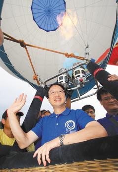 有馬英九力挺,“行政院長”江宜樺(中)昨天將“請辭”傳聞拋在腦后,展現自信體驗臺東熱氣球“高飛”的快感。圖片來源:臺灣《聯合報》