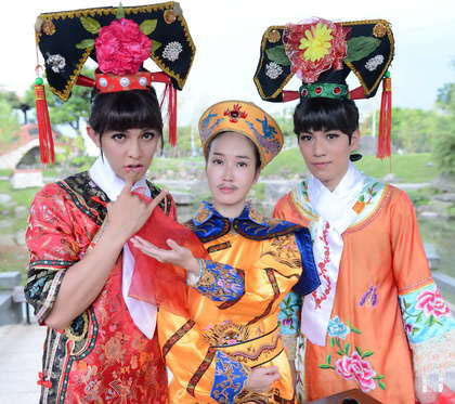 汪東城(左)、SpeXial子閎(右)在劇中扮女裝,巴鈺貼上假胡子扮皇上。(圖片來自臺媒)