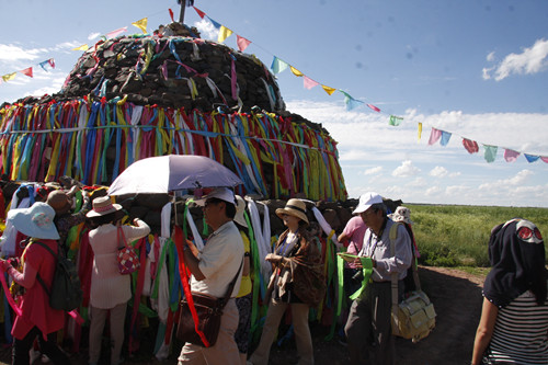 參加“情系燕趙”活動(dòng)的臺(tái)灣嘉賓按照蒙古族風(fēng)俗在敖包祭祀(中國(guó)臺(tái)灣網(wǎng) 蕪?fù)?nbsp;攝)