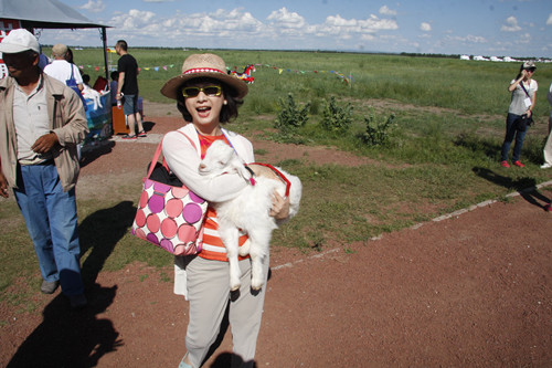 臺(tái)灣文化界人士來(lái)到敖包前,紛紛拿起祭祀的平安帶,圍繞著敖包走上三圈,然后把平安帶系在敖包上,為家人祈福。原臺(tái)灣著名電視主持人、臺(tái)中市文化局長(zhǎng)葉樹姍祭祀完敖包,又走到草地上抱著一只剛出生20天的潔白的小羊羔,讓朋友幫她拍照留念。她疼愛地說(shuō),我覺的這只小羊就像是我前世的女兒。