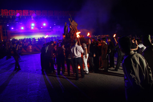 在篝火晚會現場,蒙古族勇士表演打樹花,將1600度的鐵水潑向天空,形成美麗的火花(中國臺灣網 蕪同 攝)