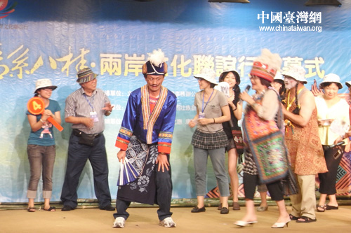 對各位臺灣嘉賓來講,最關心的莫過于籌備兩岸文化界嘉賓大聯歡。這場大聯歡,是每屆“情系”活動的重場戲,一般安排在活動的最后一天閉幕式上,方式是由兩岸文化界嘉賓以參觀旅行中的大巴車為單位,各顯其能,或發揮自已特長,或反串角色拿出看家本領,充分奉獻出自己的聰明才藝。每年的大聯歡節目都屢有創新,笑料百出,驚奇不斷,精彩絕倫,因此被稱為一年一度的兩岸文化界民間“春晚”。2010年“情系八桂”的《劉三姐歷險記》,2012年“情系齊魯”的“新編孟母三遷”、穿越劇《當GAGA女神遇到孔圣人》,都堪稱是不可多得的佳品。臺灣文化界嘉賓們表示,參加排練演出的經歷就像回到了中學生的快樂時代,通過演出,讓我們更加融合。