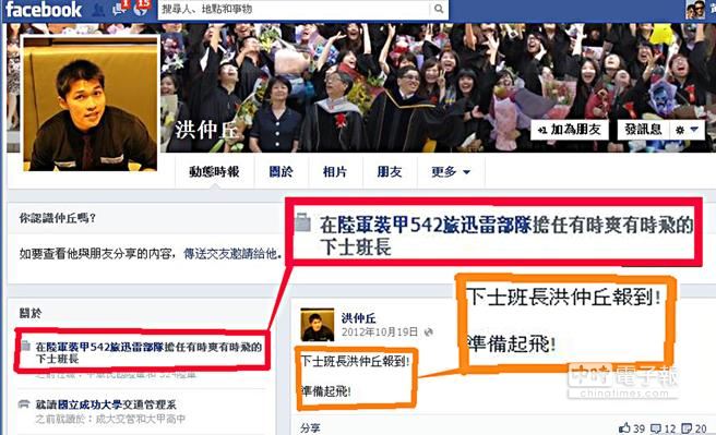 洪仲丘在臉書自陳“在路軍裝甲542旅擔任有時爽有時飛的下士班長”,還留言“下士班長洪仲丘報到!準備起飛”,不料卻在退伍前夕被關(guān)禁閉致死。圖片來源:臺灣《中國時報》