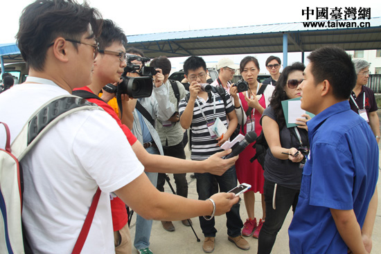 張亮在辦公樓外接受臺灣記者采訪(中國臺灣網 王文英 攝)