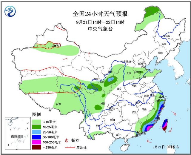 21日14時至22日14時全國天氣預(yù)報,臺灣南部臺東、屏東等地可能將降250毫米以上特大暴雨。(圖片來源:中央氣象臺)