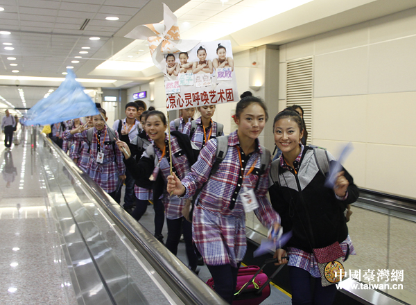 第六屆中華文化快車--北京心靈呼喚藝術團交流團一行,10月5日飛抵臺北,正式開啟兩岸中華文化交流臺灣之旅。圖為藝術團團員抵達桃園機場,難掩興奮之情。(中國臺灣網 普燕 攝)