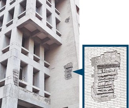 臺(tái)灣政大行政大樓是海砂屋,讓學(xué)生人人自危;圖為大樓外墻磁磚剝落露出鋼筋。(圖片來(lái)自臺(tái)媒)