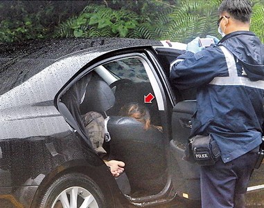 五分埔徐姓富商(后座者)疑走不出喪妻之痛,偕新婚妻(箭頭處)于車上燒炭雙亡。(臺媒圖)