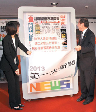 臺灣《聯(lián)合報》與張榮發(fā)基金會“票選2013第一大新聞”結果昨揭曉。張榮發(fā)基金會執(zhí)行長聶國維(右)、聯(lián)合報總編輯游美月(左)公布第一大新聞為假油等食安新聞。圖片來源:臺灣《聯(lián)合報》