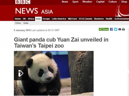 1月6日,大陸贈臺大貓熊“團團”、“圓圓”所生寶寶“圓仔”首次亮相,國際媒體爭相報道。圖為英國媒體BBC網(wǎng)站的報道。(圖片來自臺媒)