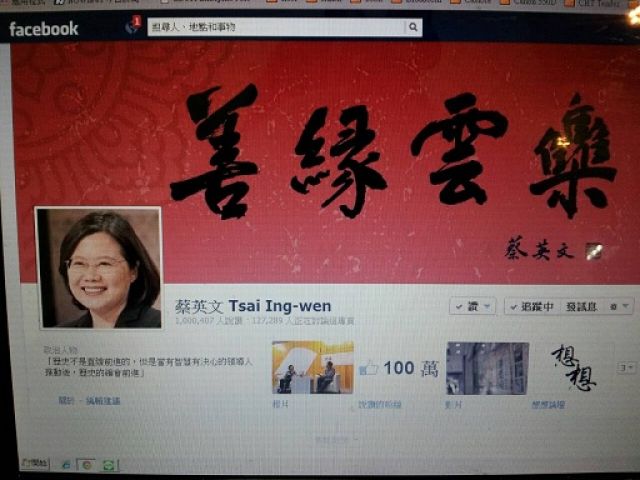 前民進黨主席蔡英文臉書粉絲破百萬人(臺媒翻攝自蔡英文臉書)