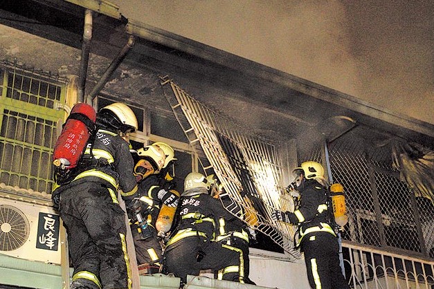 臺中一間兩層樓民宅起火,消防隊從屋外破壞陽臺鐵窗進屋搜救,但仍不幸造成三死。(臺媒圖)