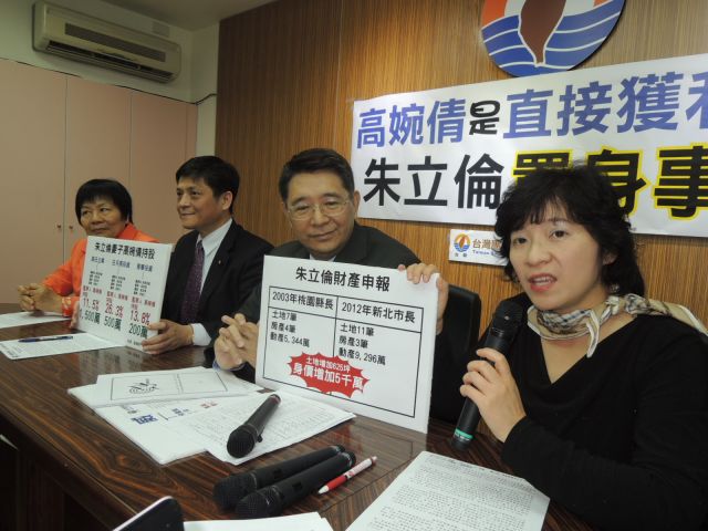 臺聯(lián)黨黨團指出,朱立倫妻子高婉倩投資高氏企業(yè)、日月高投資及育華投資等3家公司1500萬元至200萬元新臺幣不等,同時還擔任公司監(jiān)察人,而這3家公司也直接或間接投資威創(chuàng)科技,朱立倫也等同直接獲利,恐已涉及貪瀆。