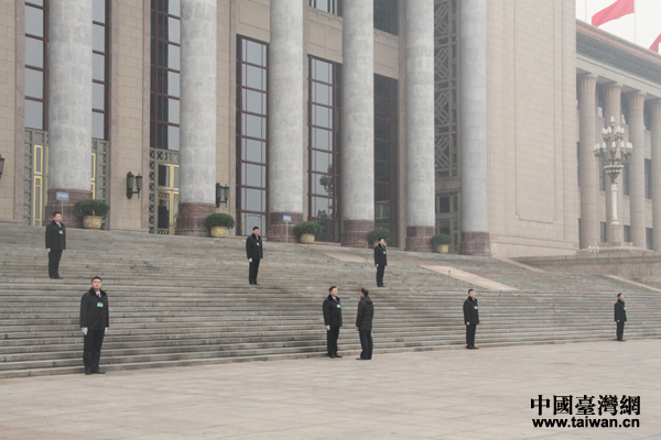 3月3日,中國人民政治協商會議第十二屆全國委員會第二次會議在北京人民大會堂開幕。開幕會開始前,人民大會堂安保人員準備就緒。(中國臺灣網 張潔 攝)