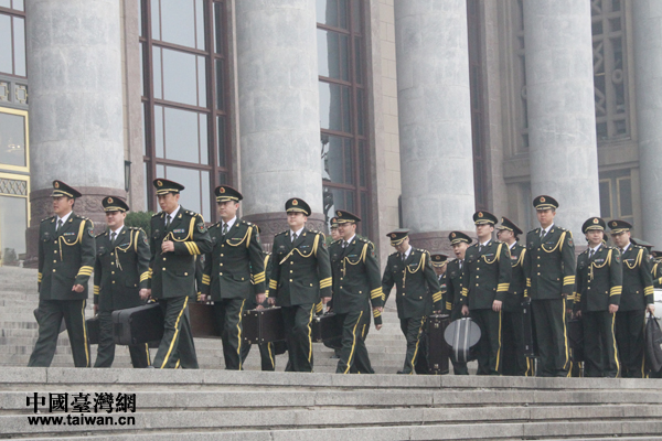 開幕會開始前,中國人民解放軍樂團進入人民大會堂。(中國臺灣網 張潔 攝)