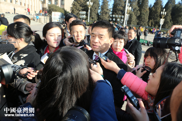 各路記者奮力“圍堵”人大代表。(中國臺灣網 王思羽 攝)