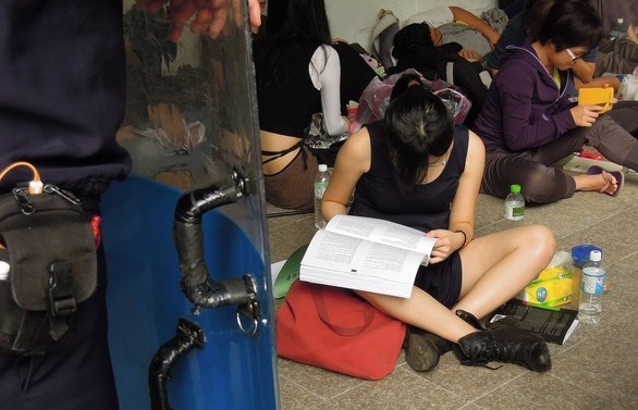 反服貿(mào)女學(xué)生警盾前就地溫書(shū)。(臺(tái)媒圖)