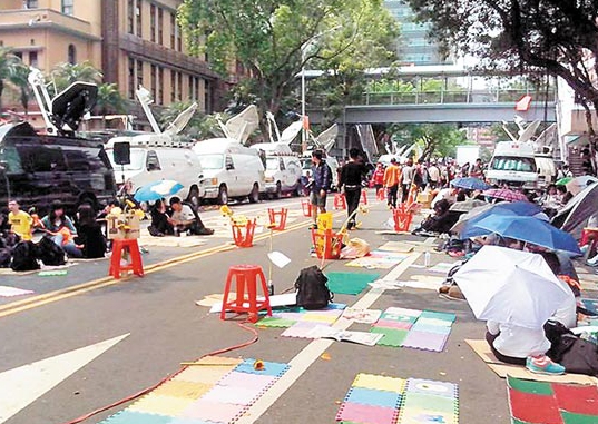 昨日,學生占領“立法院”第9天,街上椅凳閑置倒放,靜坐人數漸少。來自臺媒
