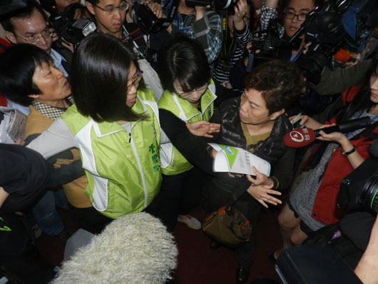 中國臺灣網(wǎng)4月2日消息 據(jù)臺灣“中央社”報(bào)道,民進(jìn)黨籍“立委”今天擋在排定審查服貿(mào)的會議室外,多位國民黨籍“立委”欲進(jìn)入開會,一度爆發(fā)推擠叫罵,最后仍不得其門而入。
