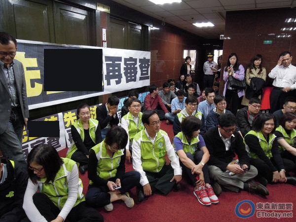 “立法院內政委員會”等8個常設“委員會”今天聯席初審服貿協議。民進黨籍“立委”一早守在排定審查服貿的會議室外,阻擋國民黨籍“立委”、官員,導致他們無法進入開會。