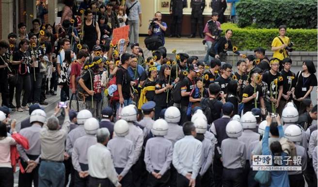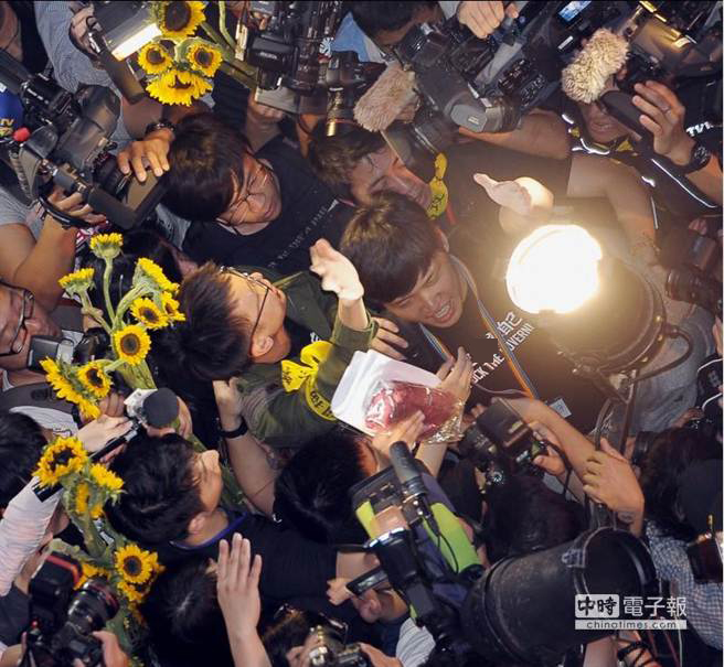 占領“立法院”議場的學生10日傍晚在發表聲明后,人手一枝太陽花,在警力的戒備下步出議場。(圖片來自臺媒)