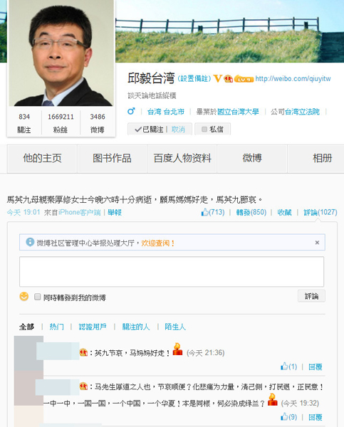 據(jù)臺灣東森新聞報道,秦厚修是湖南長沙人,從湖南、香港輾轉(zhuǎn)來到臺灣,2日因多重器官衰竭病逝,結(jié)束93歲的人生。她逝世的消息曝光后,大陸媒體紛紛報導(dǎo),前國民黨“立委”邱毅也于晚間7時許發(fā)微博:“愿馬媽媽好走,馬英九節(jié)哀!痹S多大陸網(wǎng)友轉(zhuǎn)貼消息,3小時就涌入破千條留言。