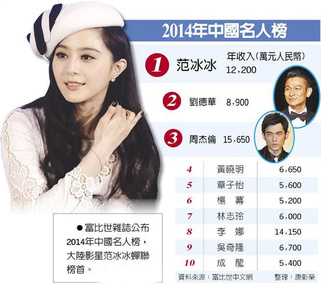 福布斯中國名人榜,范冰冰居首,劉德華第二周杰倫第三。(圖片來源:臺灣中時電子報)