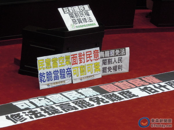 在野黨“立委”持續占據主席臺,截至下午1點10分“院會”仍然空轉。(圖片來自臺媒)