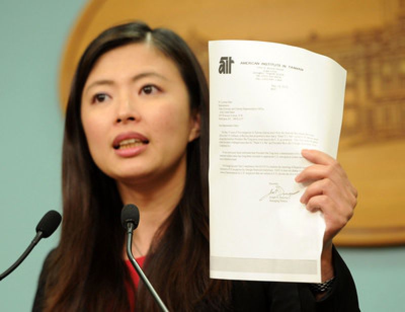 馬辦發言人李佳霏15日舉行記者會,公布一份美國在臺協會提供的文件,證明馬英九已無美國綠卡。(圖片來源:臺灣“中央社”)