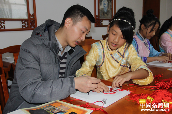 記者向滿族孩子學習如果編織中國結(jié)(中國臺灣網(wǎng)楊永青攝)