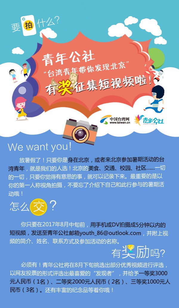 青年公社現正式開啟“臺灣青年帶你發現北京”短視頻征集活動,這個暑假,用你的視角發現北京,贏千元獎金!