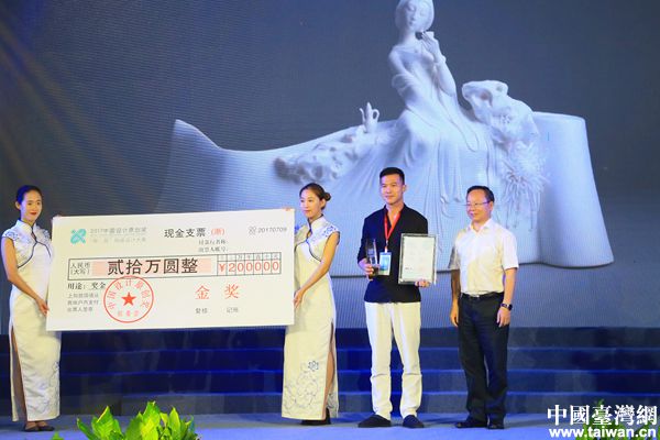 浙江省政協(xié)副主席陳小平為金獎獲得者李錦峰頒獎,獲獎作品為《顏如玉—暗香盈袖》。(中國臺灣發(fā))