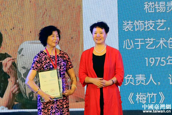 浙江聯(lián)合中小企業(yè)控股集團董事長周穎為入圍獎獲獎?wù)唿S強頒獎,獲獎作品為《奇石方磚套壺》。(中國臺灣網(wǎng) 盧佳靜 攝)