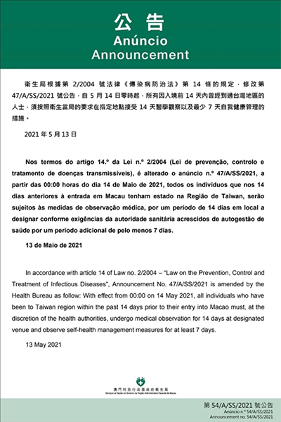 中國(guó)臺(tái)灣網(wǎng)5月14日訊 據(jù)澳門特別行政區(qū)官網(wǎng)消息,澳門特別行政區(qū)新型冠狀病毒感染應(yīng)變協(xié)調(diào)中心13日下午宣布,因應(yīng)臺(tái)灣地區(qū)的疫情變化,澳門衛(wèi)生局根據(jù)相關(guān)規(guī)定,自2021年5月14日零時(shí)起,所有因入境前14天內(nèi)曾經(jīng)到過臺(tái)灣地區(qū)的人士,須按照衛(wèi)生當(dāng)局的要求,在指定地點(diǎn)接受14天醫(yī)學(xué)觀察以及最少7天自我健康管理,自我健康管理期間人士的澳門健康碼會(huì)轉(zhuǎn)為黃色。