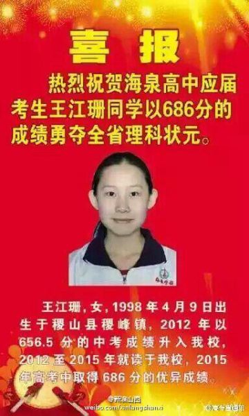 2015年山西的理科狀元來自山西運(yùn)城市新絳縣海泉中學(xué),應(yīng)屆生1208班王江珊,成績686分