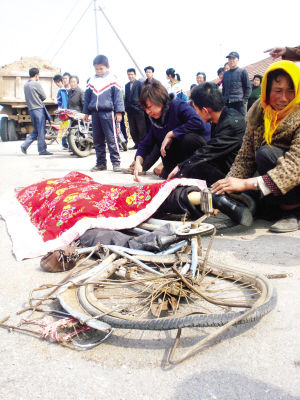 中午12時許,記者趕到現場看到,被撞身亡的女老師王格香伏在自行車上已經血肉模糊,她的家人圍坐在一起痛不欲生,十多名交警正在現場調查取證!袄蠋,你醒醒!老師,你醒醒!”面對老師的離去,十多名孩子一遍一遍呼喊著老師,站在王格香的遺體旁不愿離去!