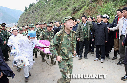 5月14日,國務院總理溫家寶抵達地震重災區四川北川縣察看災情。這是溫家寶在距北川縣縣城僅兩公里的曲山鎮察看災情時,幾名戰士抬著一個小女孩從縣城方向跑過來,溫家寶和隨行人員趕緊讓路。溫家寶說,時間就是生命,要盡全力救人。 新華社記者姚大偉攝